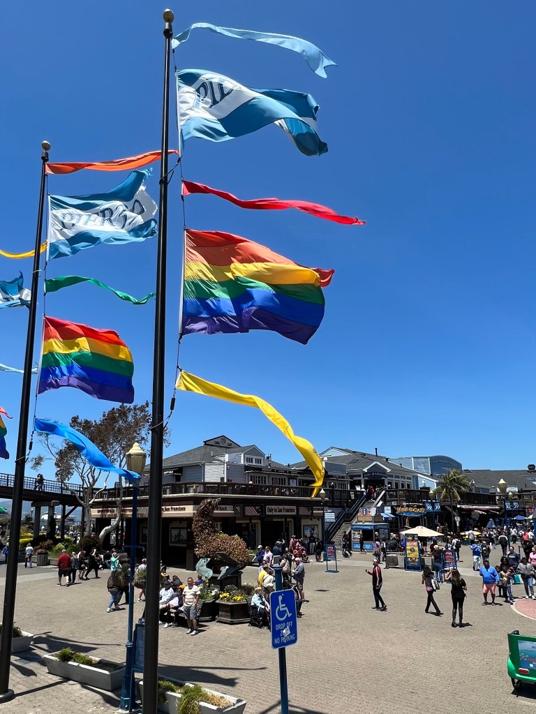 … be sure to wear flowers in your hair.“ Tja, diese Songzeilen sind schon alt und stammen aus einer Hippie-Hymne Ende der 1960er Jahre. Das war sicher eine verrückte Zeit hier in San Francisco! Auch heute noch spürt man diesen Freigeist, den Individualismus, die Toleranz und eine gewisse Freizügigkeit. Die Stadt ist bunt. Heute prägt nicht mehr die Hippie-Kultur das Stadtbild, sondern die LGBTQIA+ Gemeinschaft mit den Regenbogenfarben, die sich überall widerspiegeln – vom Businessviertel bis zum Pier39 mit den Souvenirständen.