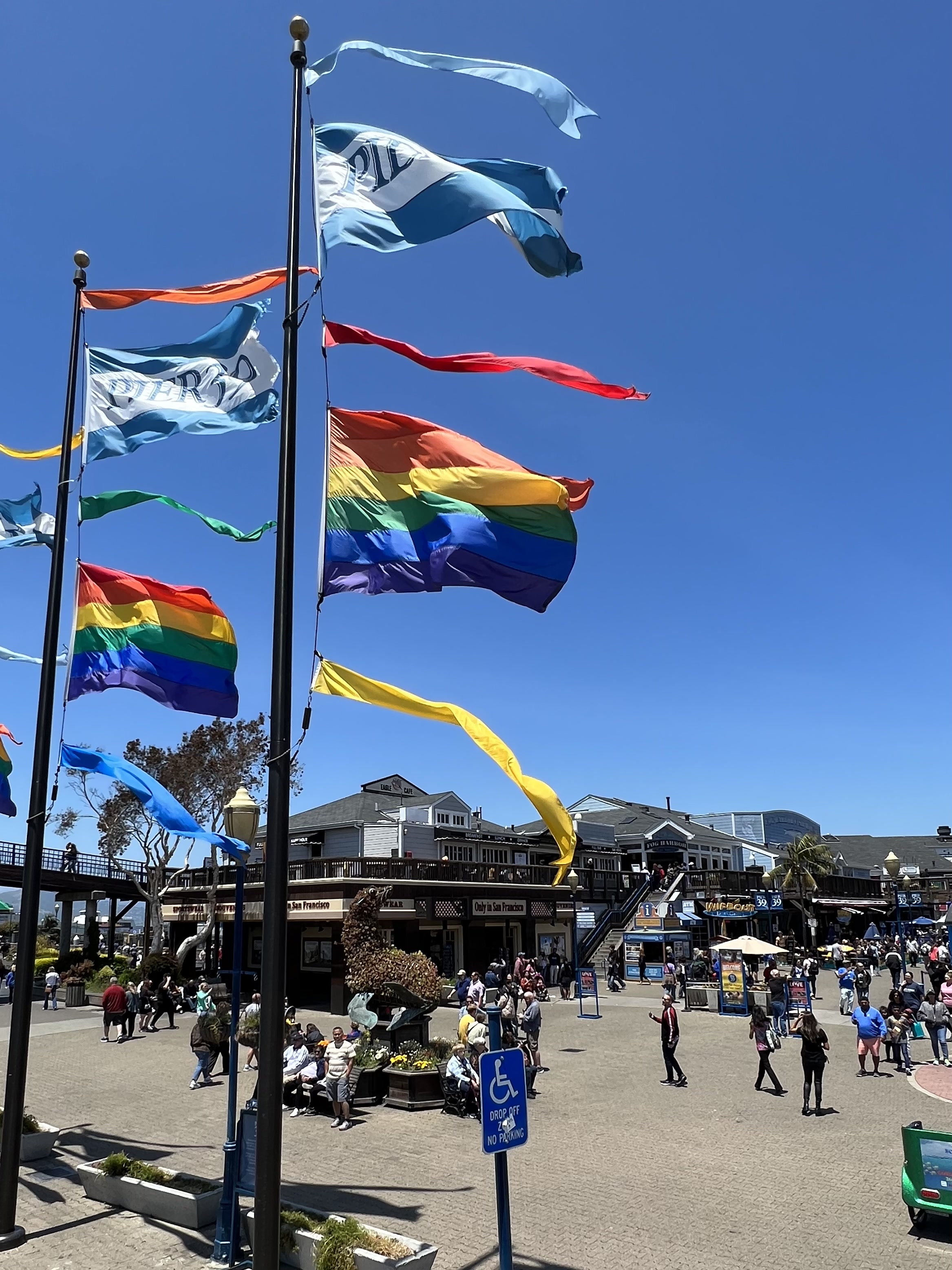 … be sure to wear flowers in your hair.“ Tja, diese Songzeilen sind schon alt und stammen aus einer Hippie-Hymne Ende der 1960er Jahre. Das war sicher eine verrückte Zeit hier in San Francisco! Auch heute noch spürt man diesen Freigeist, den Individualismus, die Toleranz und eine gewisse Freizügigkeit. Die Stadt ist bunt. Heute prägt nicht mehr die Hippie-Kultur das Stadtbild, sondern die LGBTQIA+ Gemeinschaft mit den Regenbogenfarben, die sich überall widerspiegeln – vom Businessviertel bis zum Pier39 mit den Souvenirständen.